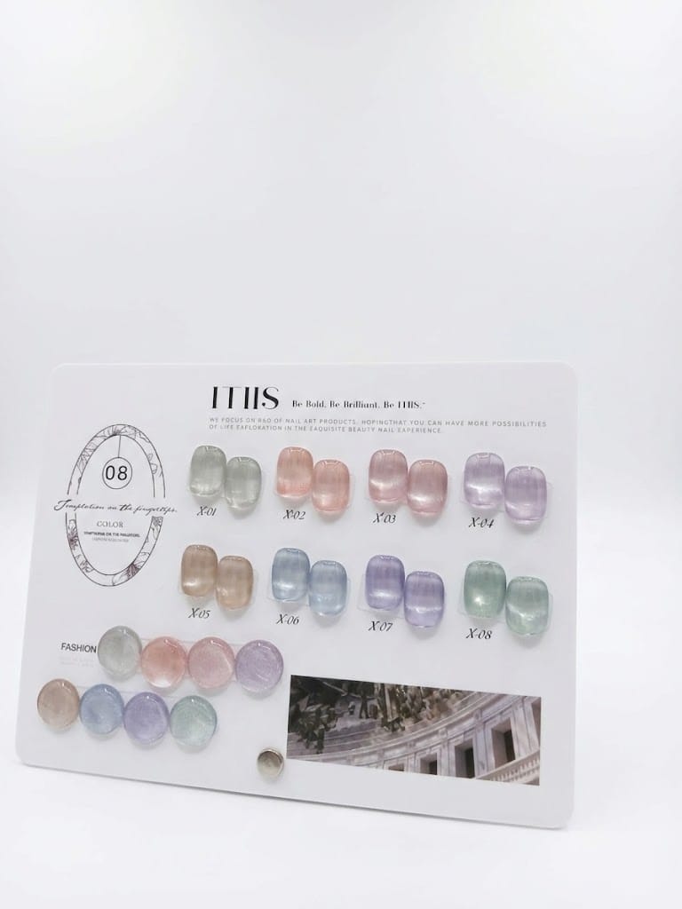 The ITIIS Professional Cat Eye Shimmer Gel Collection is a sophisticated range of luminous, magnetic shades designed to deliver depth, dimension, and elegance in every application. This curated shade card features soft pastels, metallic neutrals, and radiant jewel tones, enhanced with fine shimmer particles for a smooth, reflective finish.